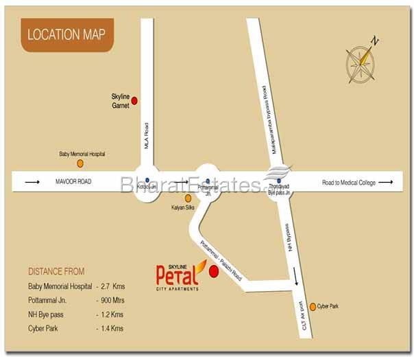 Coming up at Pottammal, off Mavoor Road is Skyline Petal, 2&3 bed apartments. Each home like a petal of a fragrant flower, this apartment complex imbibes Skyline expertise proven over 115 projects across Kerala. Yet another unique example of a Skyline project is Petal. Taken out of the versatile repertoire of 115 housing projects, this stand alone tower comprises of 78 two and three bed apartment units. Endowed with elegant design, Skyline Petal places you close to the city heart, but comfortably away from the crowds. Skyline Petal is blooming right close to the National highway and near to medical college. The urban convenience of a heart of the city location and the suburban tranquility of a village like ambience give you the best of both worlds. Shopping, worship places, dining out, banking... all are within a stone's throw.