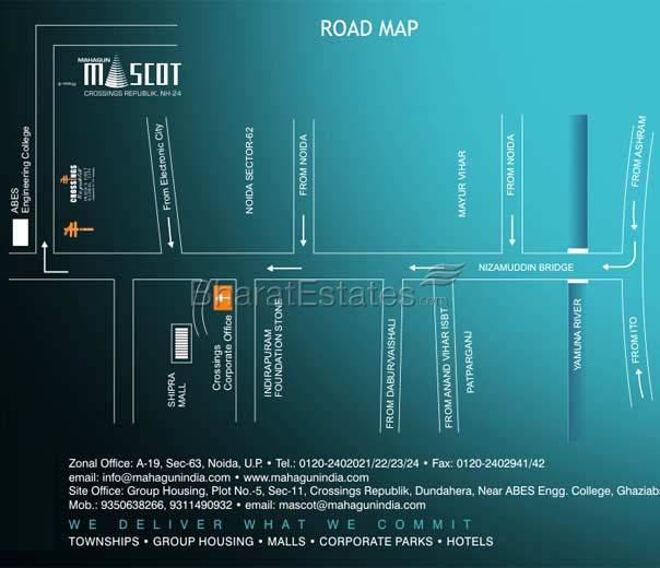Mahagun Mascot: Welcome to the world of comfort & luxury at Mahagun Mascot. Ensconced among the lush greens of Crossing Republic India's first global city spread across more than 360 acres- and flanked with iconic towers, Mahagun Mascot offers a unique opportunity to enjoy the peace and tranquility of the surroundings, coupled with the pleasure of living in a world class environs at a distance only of 19 kms from the Delhi border. Beside the unparalled joys of floating garden, water bodies, amphitheatre, yoga deck, mini golf course, drop off plaza and lots more. Round the clock security and controlled access with provision of Video Door-Phones offer unparalled peace of mind.The pleasure of living at Mahagun Mascot does not end here, the next level of joy extends to the club – Mahagun Myriad. Where the good time settle down in sprawling environs encompassing all the necessities essential for a complete unwind. Be it lawn tennis court, squash court, water therapy of the pool or a bar in an evening get-together, the Myraid has it all. The premises of Myraid promise nothing but to turn the leisure hours into pleasure hours.