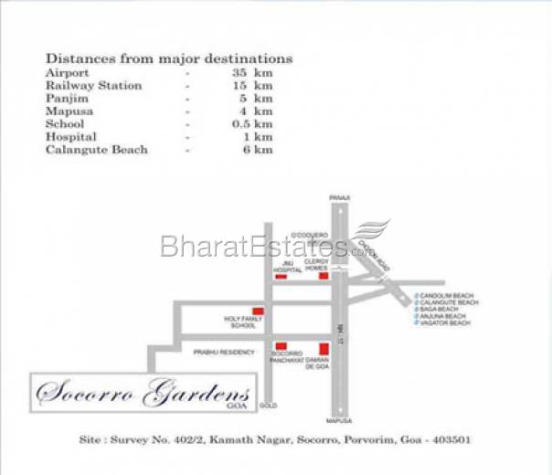 "Socorro Gardens" is situated in the lush green area right in the center of North Goa.” Its strategic location at Porvorim in Socorro Village gives the peace of a village life away from noise and pollution. Its proximity to the hush hush capital of Goa, "PANJIM", is just at 10 minute drive on one hand and the world famous beaches of Baga and Calangute with their pubs and cafes are another 15 minute drive. The daily utilities such as a super market, restaurant, school, hospital, temple and churches, banks and public transport are all at a stones throw. Its proximity to the proposed IT park (Proposed by the Government of Goa) and the proposed IT SEZ gives it an added advantage.