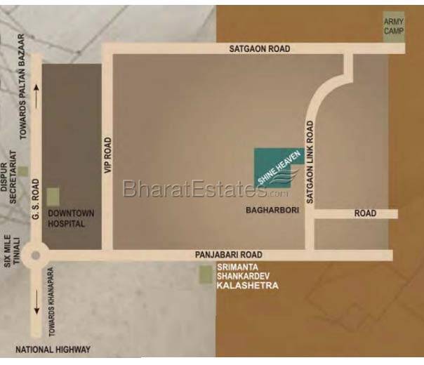 Shine Heaven is located on the Satgaon Link Road. The Project site is around 1.5 Km from the Panjabari Road. This link road is also connected to the Satgaon Army Camp which is around 2 Km from the site. The distance from G.S Road Sixmile Tiniali is around 3.7 Km and the Assam Secretariat, Dispur ia around 6Km from the site.Srimanta Sankardev Kalashetra is around 2.3Km from the site