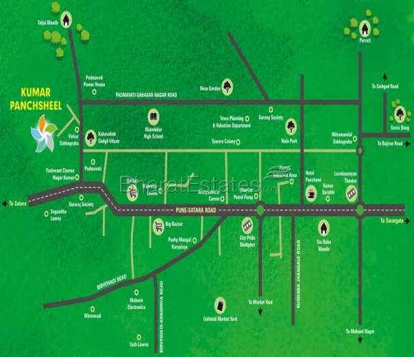 Located in Padmavati – one of Pune’s developed areas – ‘Kumar Panchsheel’ is well-connected to Sahakar Nagar, Dhankavdi, Katraj, Pune-Satara Road, Bibvewadi and Market yard.