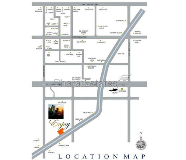 Enjoy, an exquisitely designed apartment complex amidst blissful greenery, is located at Vesu. Inspired architecture, peaceful surroundings, spacious living areas, thoughtfully designed apartments, a central location close to well known malls and schools with all the modern facilities.