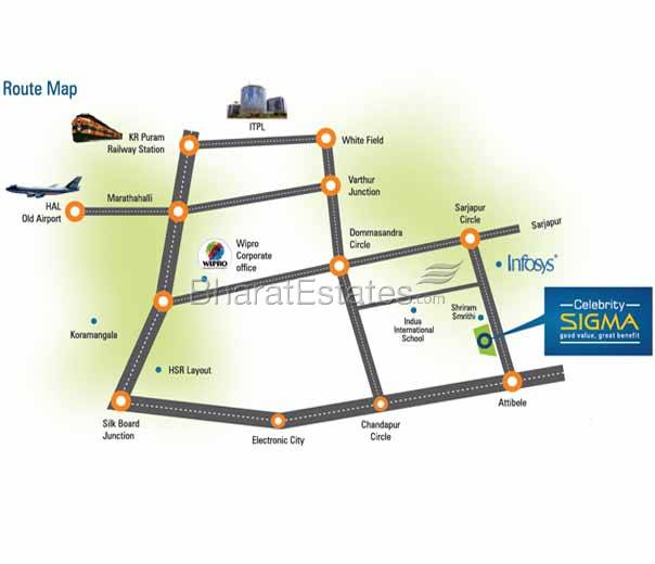 Celebrity Sigma is loacated near Sarjapur Attibele Road and close to Wipro Corporate office, Marathalli ring road, Electronic City, major schools and hospitals. While the property is just off the main road, it is surrounded bya tranquil atmosphere with lush green landscape. The well-connected roads make accessibility to Electronic City and other areas of bangalore a smooth drive.