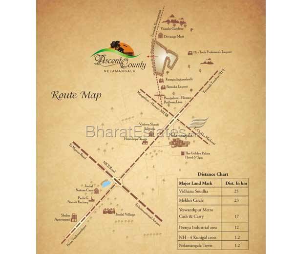 Ascent County is located near Nelamangala at a distance of 1.2km from NH4 Kunigal cross, on 40 ft. wide (to be widened to 80 ft.) Nelamangala – Shivagange Main Road en-route to the historical hills of Shivagange with one side 6 lane NH4 leading to Tumkur & to the other side HN48 leading to Mangalore. The beautiful park at Binnamangala and the serene Vishwa Shanti Ashram are close by.