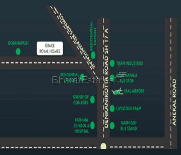 GRACE ROYAL HOMES is close to SEZ in kelamangalam road, Sanctioned 300 ft Road, well developed layouts and villas, schools, colleges, Hospitals, Police Station, Taluk office, Registration office, Shopping complex, Market place, Engineering College and Medical College. Additionally. GRACE ROYAL HOMES is situated about 8 minutes drive from Hosur Bus Stop and 5 min drive from railway station, 2 kms from TAAL airport and is only 45 minutes away from the Bangalore International Airport.