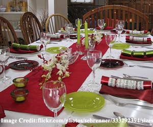 Cutlery or table elements of Christmas colors:As everybody knows red, white and green are prominent colors of Christmas hence highlight your dining table with red and green dinner sets. If you feel red and green crockery is just popping out too much then you can opt for red or green table napkins. You can also keep the crockery simple plain white color and highlight rest of the elements with bright red or green color.