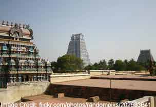 It was said that Vibhishana, younger brother of the Asura King Raavana was returning home after coronation of Rama. He had the idol of Lord Ranganathar with him and he was warned if he keeps that idol down, it would get affixed there forever. When he went to take bath he handed over the idol to Lord Ganesha who had disguised himself as a Brahmin boy. Ganesha kept the idol on the ground and ran away. The idol got fixed to the ground. Seeing this Vibhishana went in search of the boy who revealed himself as Lord Ganesha. Vibhishana apologized and returned to Lanka.It is said that the place where Lord Ganesha placed Lord Ranganathar deity, is the place where this temple was built. It is about seven kilometers away from the Rock fort temple. The main temple is dedicated to Lord Vishnu. It has 21 Gopurams (towers) and perhaps the largest in India. The temple complex is stretched out over 156 acres. The temple consists of seven concentric rectangular enclosures. This is the only temple in India with seven enclosures.Thaymanaswamy Temple: