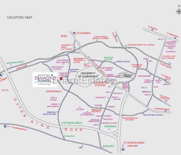 Coming up on 11acres of prime land in Gopanapally, Gachibowli, Manjeera Diamond Towers' Phase II comprises of 5 towers of 10 levels each, housing 3-bedroom luxury apartments starting at 1100 sft. and going up to 1500 sft. and 2-bedroom ranging between 910 sft. and 1220 sft.