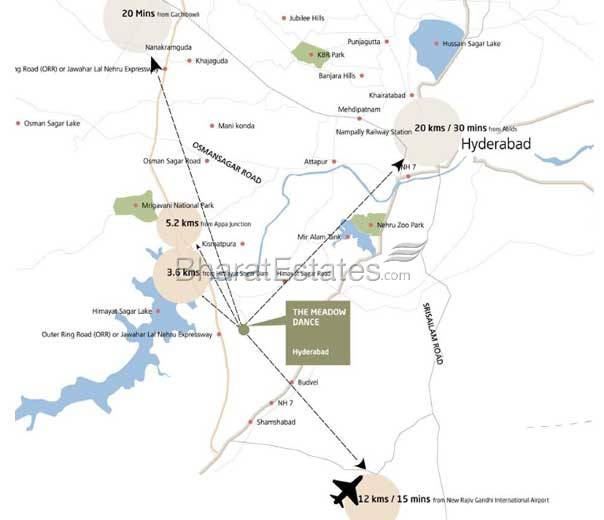 The Meadow Dance has extensive recreational facilities and superbly designed spaces and is within reach to the inner and outer ring roads, Gachibowli, Hi-Tech City, Schools, APPA Junction, Himayatsagar lake and International airport.
