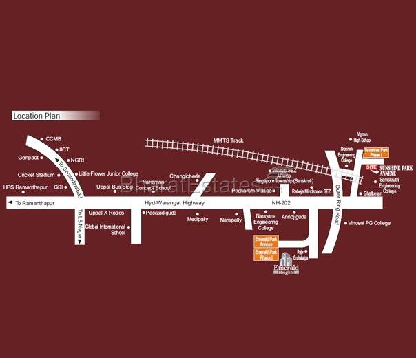Emerald Park Annexe is a homes project with state of the art amenities and recreational facilities. The project consists of about 350 premium houses with specifications to be developed in 3 phases. Located near Pocharam, one of the most serene residential areas in the city, Emerald Park is an ideal choice for those looking for a clean and pollution free neighbourhood. The venture is located at a short distance from Uppal and is close to the newly developed Singapore Township (Sanskruti) and the upcoming Raheja Infotech Park. The area is accessible by a 6-lane highway from Uppal and is located on the MMTS circuit.