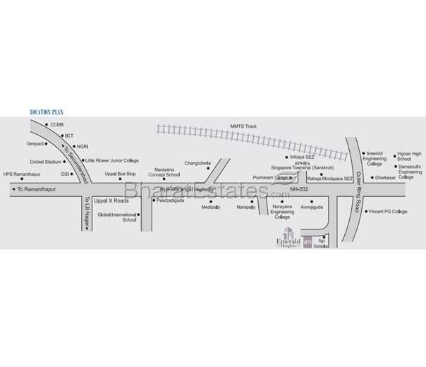 Emerald Heights is an ideal choice for people looking to live in a clean and pollution free neighbourhood. The project is located at a short distance from Uppal and is close to the newly developed Singapore Township (Sanskruti) and Mind Space IT Park as well as the new Infosys SEZ. Emerald Heights is accessible by a six lane road from Uppal and is located within the one kilometer growth corridor along the Outer Ring Road.