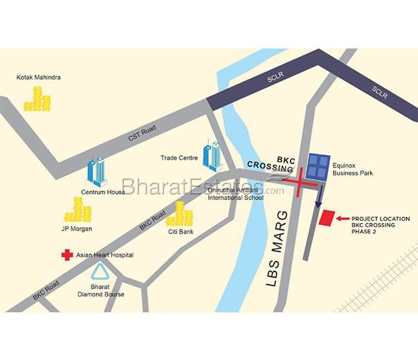 The project is located at BKC Crossing which is just 5 minutes away from BKC and is surrounded by Fortune 500 companies like Citigroup, J.P. Morgan Chase, ICICI Bank, Standard Chartered Bank, NSE, Bharat Diamond Bourse, Reliance, Essar Group and many more. Schools like Dhirubhai Ambani School, American School and cafes like Starbucks, Cafe Coffee Day are in the vicinity 10 minutes drive from Phoenix Market City, R-Mall and hospitals like Lilavati Hospital and Asian Heart Hospital. Located just 15 minutes away from airport and recreational areas such as Bandra West, Grand Hyatt, etc